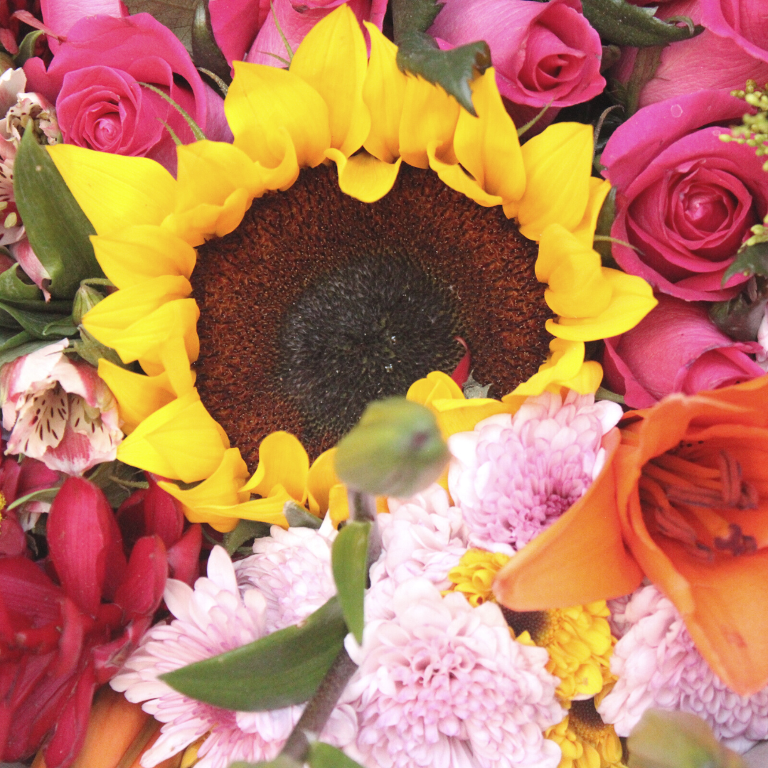 Bouquet de 24 rosas + 1 girasol en el centro y follajes de temporada.